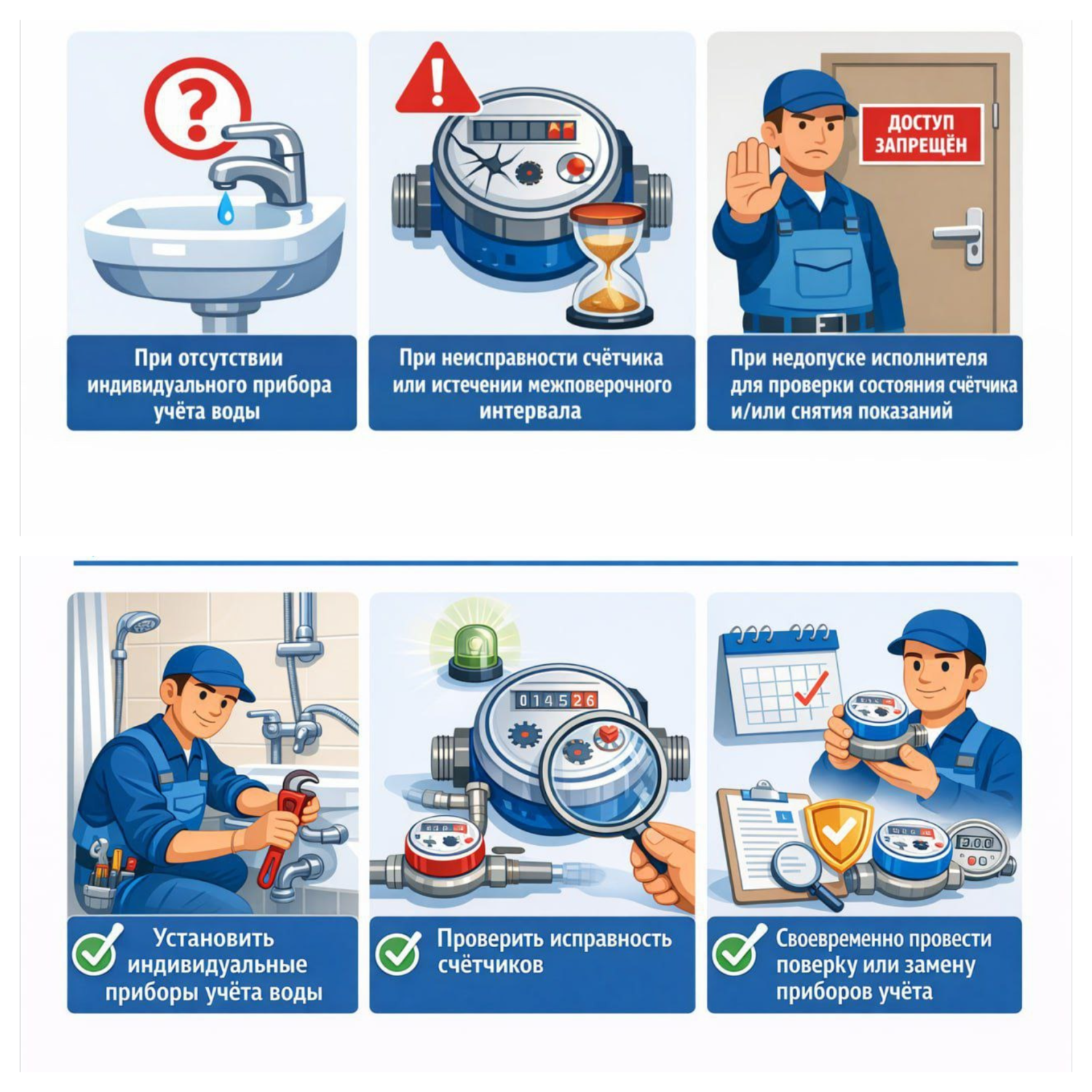 📌 Рекомендуем, чтобы избежать увеличения платы:установить индивидуальные приборы учёта воды;проверить исправность счётчиков;своевременно провести поверку или замену приборов учёта.